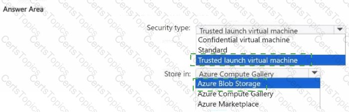 To what should you set Security type for the virtual machines, and where should you store the custom images? To answer, select the appropriate options in the answer area,