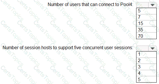 What will be the maximum number of users that can connect to Pool4, and how many session hosts are needed to support five concurrent user sessions? To answer, select the appropriate options in the answer area.