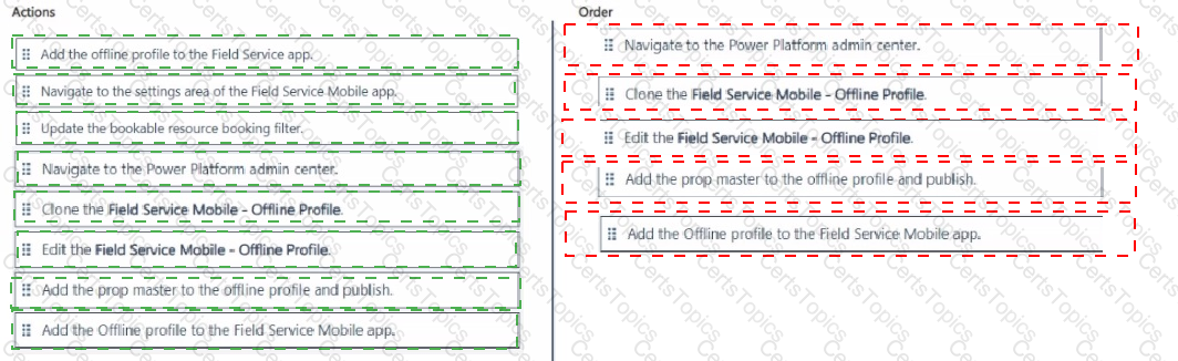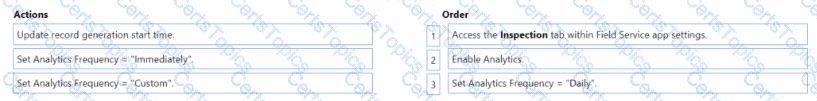 Which three actions should you perform in sequence in the Field Service app? To answer, move the three appropriate actions from the list of actions to the answer area. Arrange the three actions in the order.