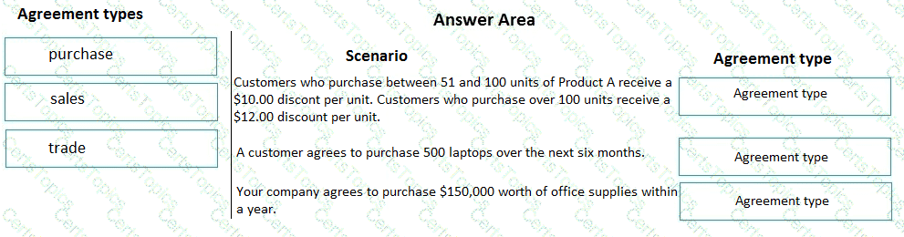 Which agreement types should you use? To answer, drag the appropriate agreement types to the appropriate scenarios. Each agreement type may be used once, more than once, or not at all. You may need to drag the split bar between panes or scroll to view content.