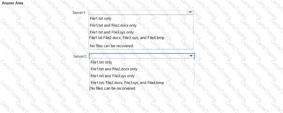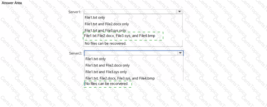 Which files can you recover if you attach Disk1 to Server1, and which files can you recover if you attach Disk1 to Server2? To answer, select the appropriate options in the answer area.