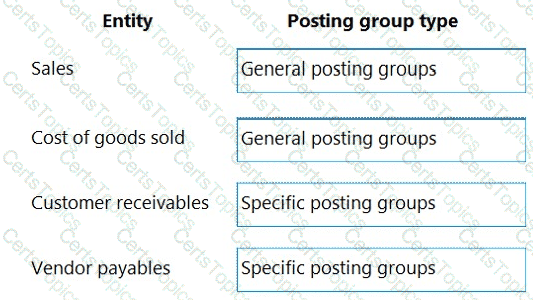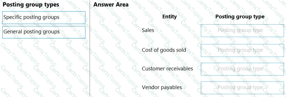 Which type of posting groups should you create? To answer, drag the appropriate posting group types to the correct entities. Each posting group type may be used once, more than once, or not at all. You may need to drag the split bar between panes or scroll to view content.