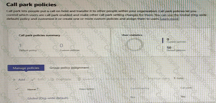 Your company currently allows call park lot all PSIN users. The call pack policies are configured as shown in the exhibit. (Click the Exhibit tab.)