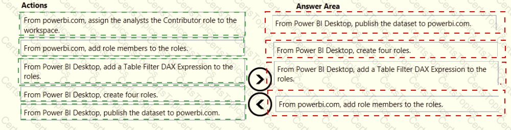 Once the profit and loss dataset is created, which four actions should you perform in sequence to ensure that the business unit analysts see the appropriate profit and loss data? To answer, move the appropriate actions from the list of actions to the answer area and arrange them in the correct order.