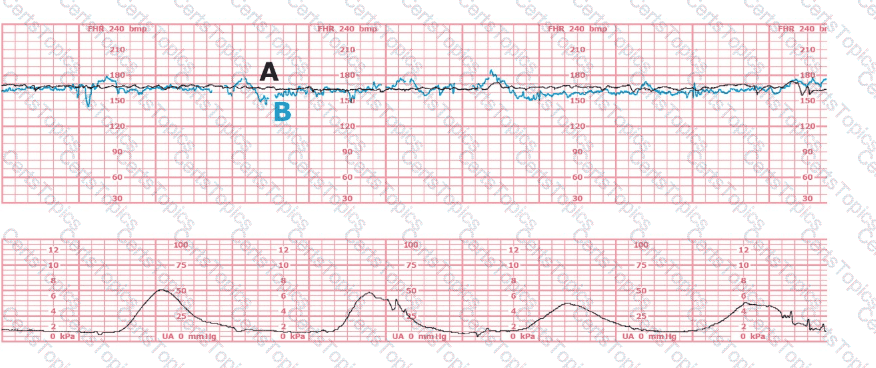 The black pattern represents the heart rate pattern for Baby A. The blue pattern represents the heart rate pattern for Baby B. A possible etiology of the baseline fetal heart rate of Baby A is: