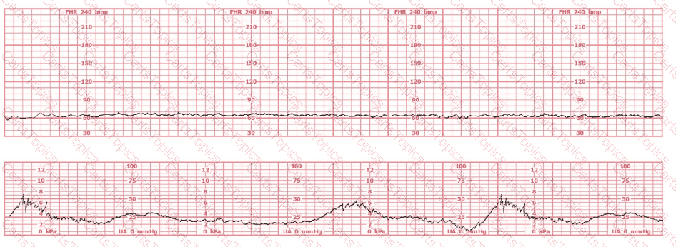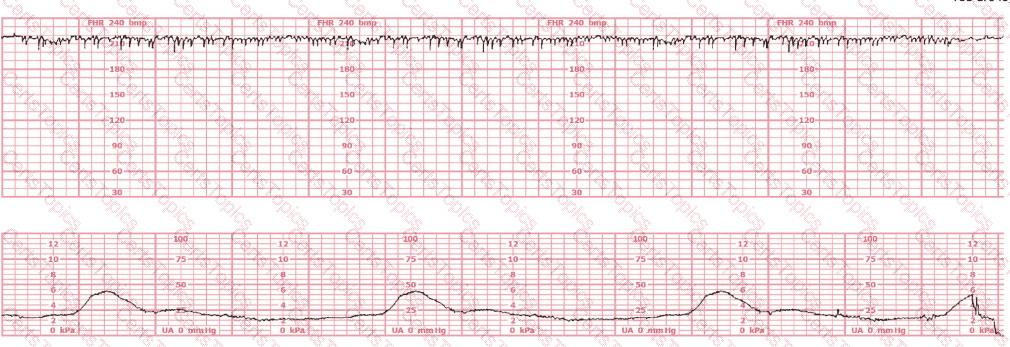 A 30-year-old woman (G2P0) is experiencing preterm labor at 26-weeks gestation. She is receiving magnesium sulfate for neuroprotection. Her external fetal monitoring tracing over the past 30 minutes is shown. The next step would be to: