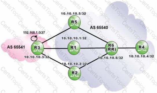 Router R6 is a route reflector with clients R1, R2 and R5. Router R3 advertises the prefix 192.168.1.0/27 to routers R1, R2 and R5. How many routes for prefix 192.168.1.0/27 will router R6 receive?