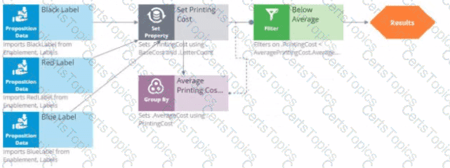 As a decisioning architect, you have built a decision strategy that selects actions that are below the average printing cost. The decision strategy contains 'Black Label', 'Red Label,' and 'Blue Label" Proposition components. The printing cost of the Proposition components are calculated based on the 'BaseCost' and 'LetterCount*.