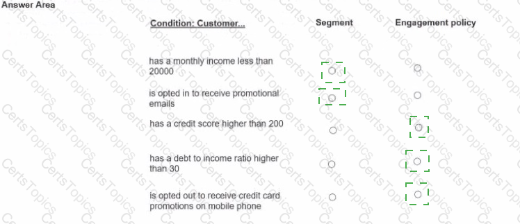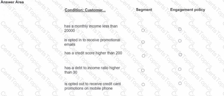 For each condition below, select which two conditions should be defined in Segment and which three conditions should be defined in Engagement policy as best practice.