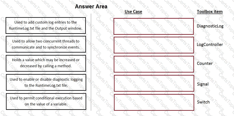 In the Answer Area, drag each use case on the left to the correct Toolbox item.
