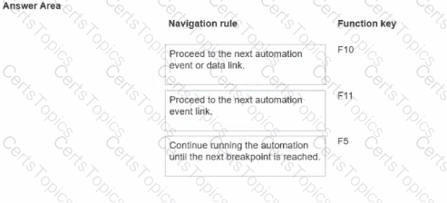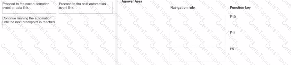 When you debug an automation, you have three function keys to use for navigating the breakpoints. Drag each navigation rule on the left to the box next to the correct function key on the right.