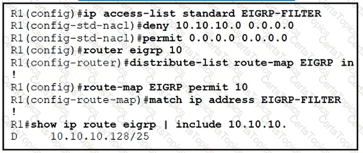 Refer to lhe exhibit An engineer must filter EIGRP updates that are received to block all 10 10 10.0/24 prefixes The engineer tests the distribute list and finds one associated prefix. Which action resolves the issue?