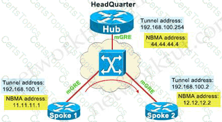 An engineer has configured DMVPN on a spoke router. What is the WAN IP address of another spoke router within the DMVPN network?