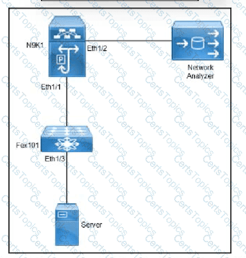 Refer to the exhibit. An engineer must configure SPAN to monitor the traffic sent to the server. The copied traffic must be sent to the network analyzer. Which configuration on N9K1 accomplishes these goals?