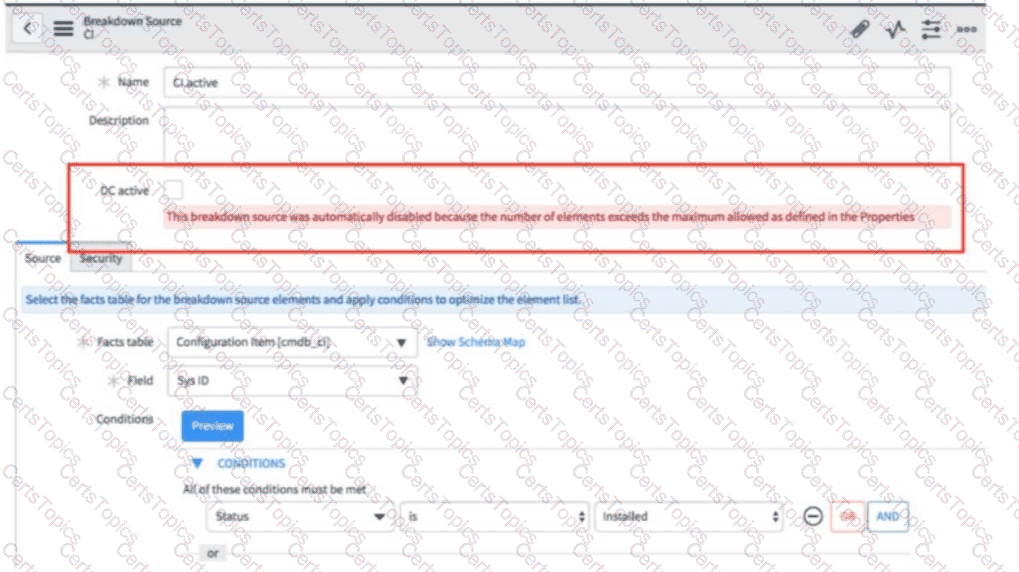 Instead, ServiceNow best practice is torefine the Breakdown Source conditions—for example, by adding filters, narrowing scope, or excluding unnecessary records—so that the number of returned elements fallsbelow the configured system threshold. Once the conditions are optimized, you can safely re-enableDC active, and the breakdown will participate in data collection successfully.