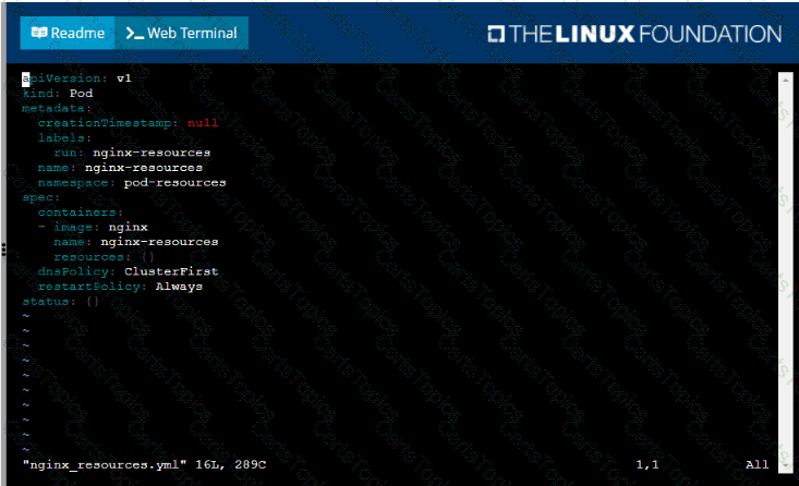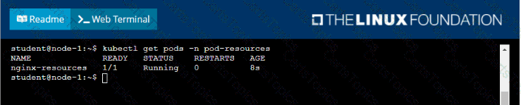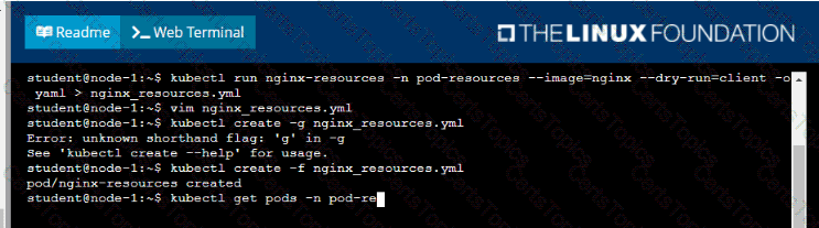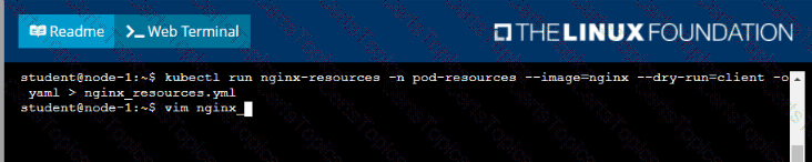 • Create a pod named nginx-resources in the pod-resources namespace that requests a minimum of 200m CPU and 1Gi memory for its container