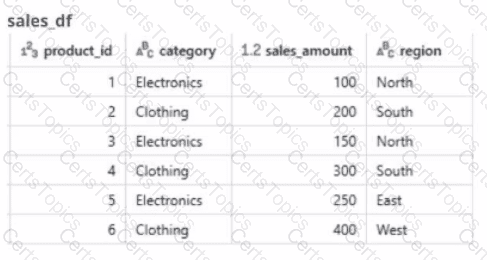 A global retail company sells products across multiple categories (e.g.. Electronics, Clothing) and regions (e.g.. North. South, East. West). The sales team has provided the data engineer with a PySpark dataframe named sales_df as below and the team wants the data engineer to analyze the sales data to help them make strategic decisions.