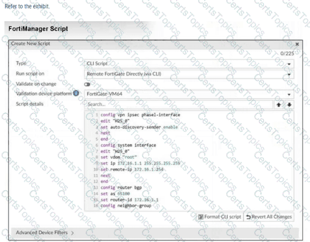 Which two actions will occur if you run the script using the Remote FortiGate Directly via CLI option? Choose two answers