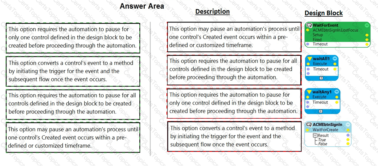 In the Answer Area, drag the description on the left to its matching Design Block.