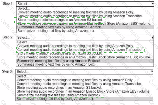 The company wants to create an application to summarize meeting audio recordings, which requires a sequence of steps involving storage, speech-to-text conversion, and text summarization. Amazon S3 is the recommended storage service for audio files, Amazon Transcribe converts audio to text, and Amazon Bedrock provides generative AI capabilities for summarization. These three steps, in this order, create an efficient workflow for the application.