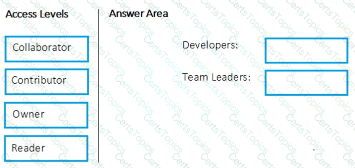 Which package feed access levels should be assigned to the Developers and Team Leaders groups for the investment planning applications suite? To answer, drag the appropriate access levels to the correct groups. Each access level may be used once, more than once, or not at all. You may need to drag the split bar between panes or scroll to view content.