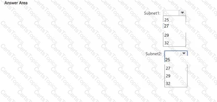 The subscription contains a virtual network named VNet1, a storage account named storage1, an Azure App Service web app named Appl. and an Azure SQL database named DB1. VNet1 contains two subnets named Subnet1 and Subnet2. Subnet 1 and Subnet2 each has a subnet mask of 255.255.255.224.