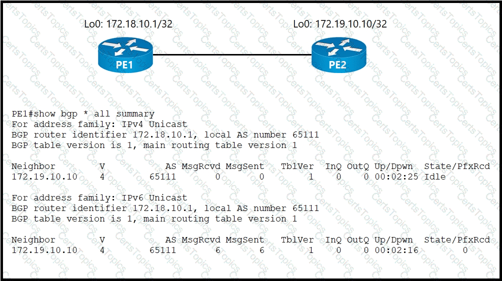 An administrator working for large ISP must connect its two POP sites to provide internet connectivity to its customers. Which configuration must the administrator perform to establish an iBGP session between routers PE1 on POP site 1 and PE2 on POP site 2?