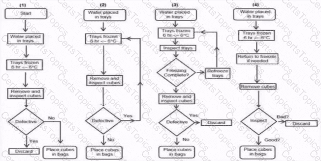 Water is delivered to ice-cube trays that are placed in freezers at less than -6° centigrade. The trays are removed from the freezers after six hours. If the water has not completely frozen, the trays are returned to the freezer until freezing is complete. The ice-cubes are then removed from the trays, inspected, and placed in bags. Defective cubes are discarded. The bags filled with cubes are kept in storage freezers. Alarms are sounded if a freezer ' s temperature goes above -6 centigrade. It has been shown that water in the ice-cube trays will freeze in six hours at -6 ' " ' centigrade or less. Which of the following correctly depicts the flowchart for the process?