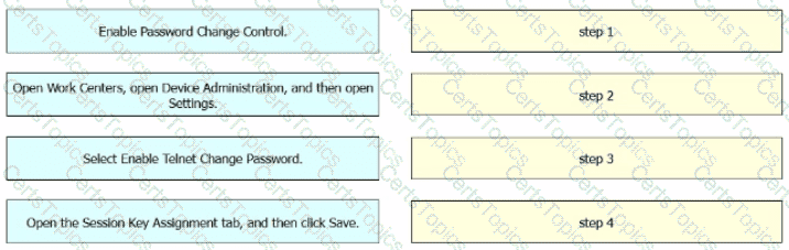An engineer must configure Cisco ISE to be used as the TACACS+ server for any administrator that signs into the router. Users must be able to change their Telnet password through the TACACS+ server. Drag and drop the configuration steps from the left into the sequence on the right.