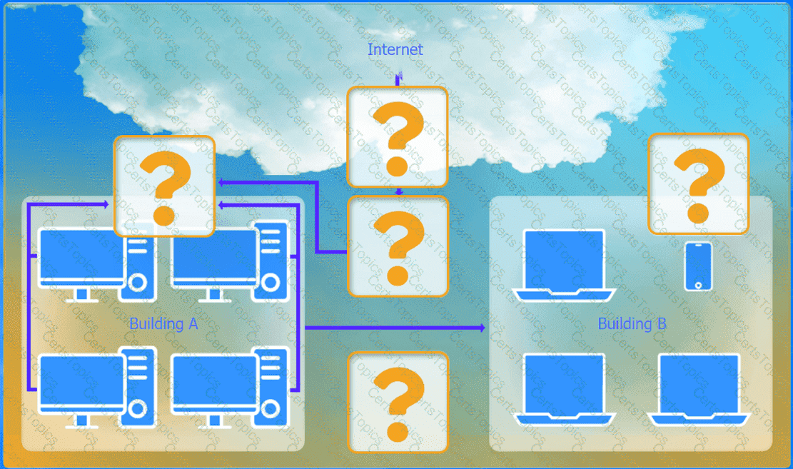 Bottom-left (Building A): Firewall (inspect traffic before it enters the network)