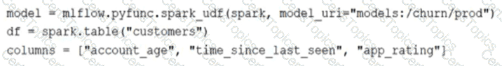 The data science team has created and logged a production using MLFlow. The model accepts a list of column names and returns a new column of type DOUBLE.