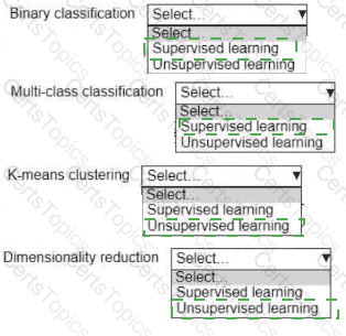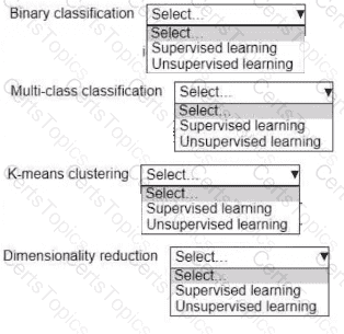 The hotspot lists four use cases, each with a dropdown containing "Select...," "Supervised learning," and "Unsupervised learning." The correct selections are: