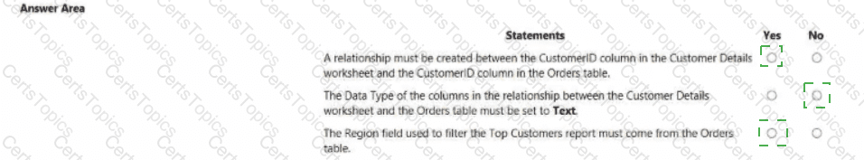You need to design the data model and the relationships for the Customer Details worksheet and the Orders table by using Power BI. The solution must meet the report requirements.