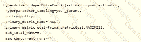 You want to use Hyperdrive to find parameters that optimize the AUC metric for the model. You configure a HyperDriveConfig for the experiment by running the following code: