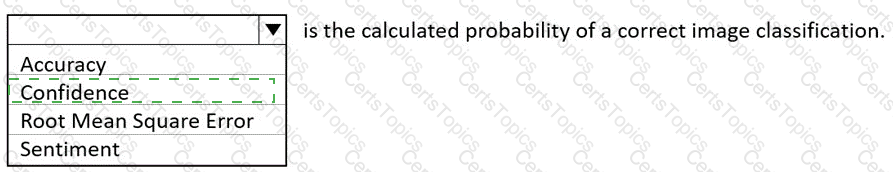 Therefore, based on Microsoft’s AI-900 training materials and Azure Cognitive Services documentation, the calculated probability of a correct image classification is called Confidence, which expresses how sure the model is about its prediction for a specific input.