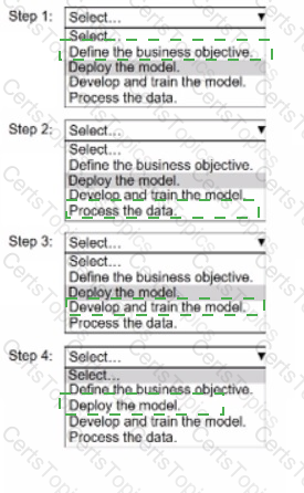 The correct order represents the machine learning lifecycle as defined by AWS in the Amazon SageMaker documentation and AWS Certified Machine Learning Specialty Study Guide. The lifecycle describes the sequence of tasks required to build, train, and deploy a custom ML model effectively.