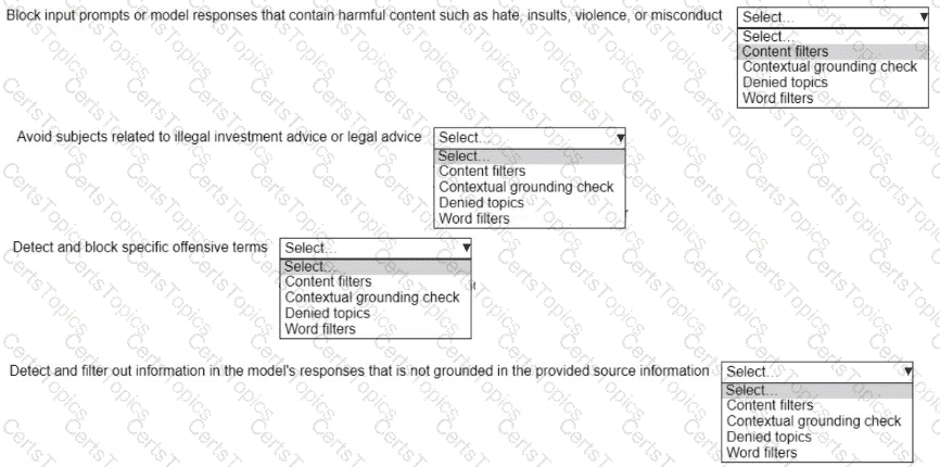 The company is using a generative AI model on Amazon Bedrock and needs to mitigate undesirable and potentially harmful content in the model’s responses. Amazon Bedrock provides several guardrail mechanisms, including content filters, denied topics, word filters, and contextual grounding checks, to ensure safe and accurate outputs. Each mitigation action in the hotspot aligns with a specific Bedrock filter policy, and each policy must be used exactly once.