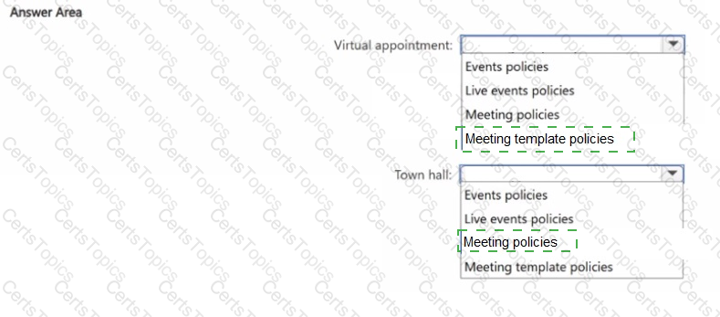 Which policies should you configure in the Microsoft Teams admin center for each feature? To answer, select the appropriate options in the answer area.