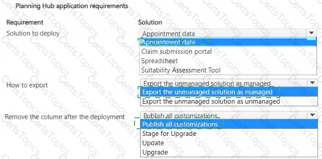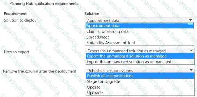 You need to deploy the changes and resolve the issue with the Planning Hub application. What should you use? To answer, select the appropriate options in the answer area.