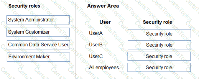 Which security roles should you use? To answer, drag the appropriate security roles to the correct users. Each security role may be used once, more than once, or not at all. You may need to drag the split bar between panes or scroll to view content.