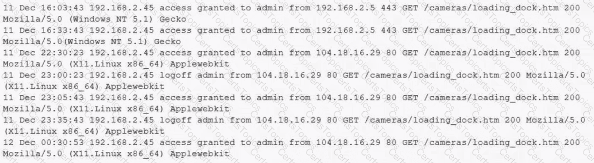 A building camera is remotely accessed and disabled from the remote console application during off-hours. A security analyst reviews the following logs: