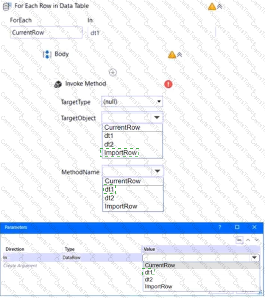 Instructions: From the drop-down lists for Invoke Method on the "For Each Row in Data Table" display, select the correct value of each field for the "Invoke Method". Next, from the drop-down